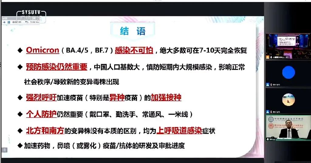 钟南山院士以视频的形式,用两个多小时向全国师生严谨专业解读了如今的奥密克戎病毒和防疫政策。直播伊始,钟南山院士强调,感染奥密克戎毒株并不可怕,绝大多数可在7—10天内完全恢复。不过,个人防护仍然重要。对个人来说,仍然要加强防护,坚持戴口罩、保持距离,减少公众聚集。他还强烈呼吁加速疫苗特别是异种疫苗的接种,也建议加快对这些药物的研发和审批进度。钟南山院士建议:不用为感染而害怕,大多数感染者不需要去医院,居家注意常做抗原检测。大讲堂的尾声,钟南山院士这样展望:“我相信,经过我们的努力,在明年初,一个非常开放、阳光、乐观的很有生气的社会,一定会实现!”