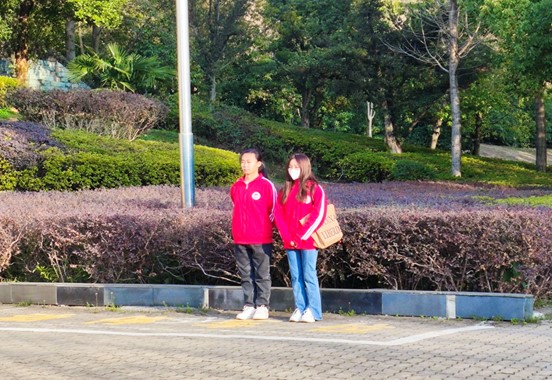 图为志愿者在教学楼路口值班