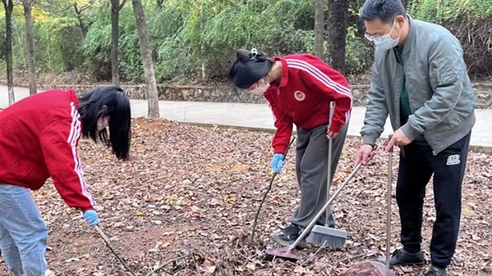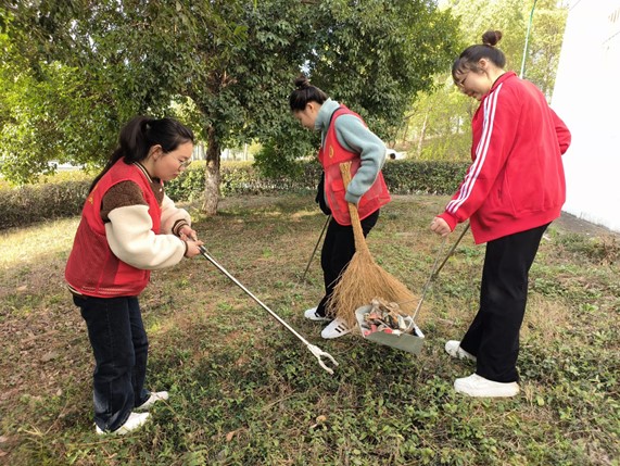 图为活动期间志愿者打扫校园垃圾