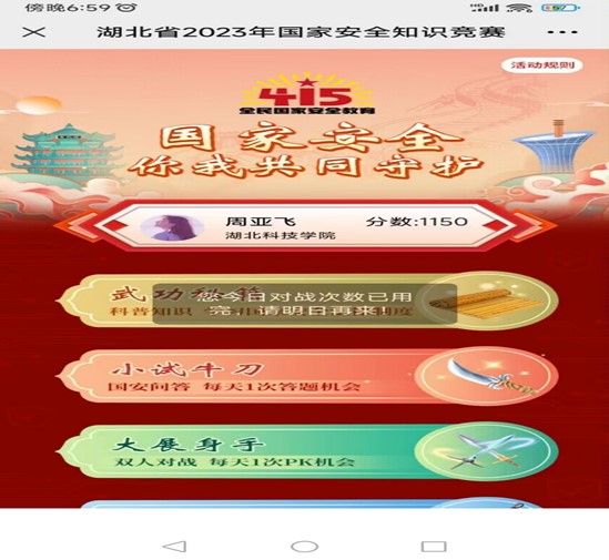4月15日,是全民国家安全教育日。为认真做好“全民国家全安全教育日”宣传教育活动。大力推进国家安全教育进学校,增强大学生安全意识,积极营造“国家安全,人人有责”的良好氛围。BBIN波音平台百家乐组织学生参加以“国家安全,你我共同守护”为主题的全省国家安全知识大赛。