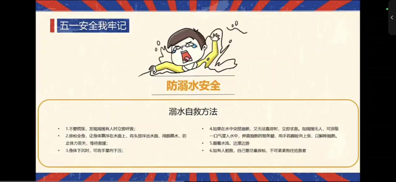 成于安全,败于事故。任何一起事故对学生本人都是一种不可挽回的损失,对家庭、个人更是造成无法弥补的伤痛。安全意识应始终牢牢扎根在每个人的心中。本次班会让大家正确认识到安全不是一个人的问题,而是你中有我,我中有你,是一个上下关联、人人互保、环环相扣的链,是一张错综复杂、紧密相连的网。大家在享受假期的时候一定不要忘记保护自己的安全,遇事不慌张!
