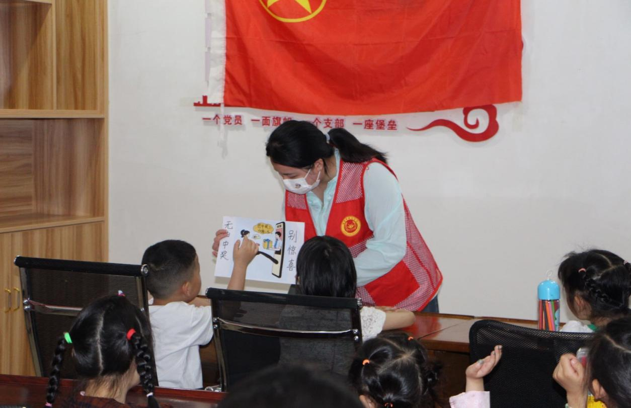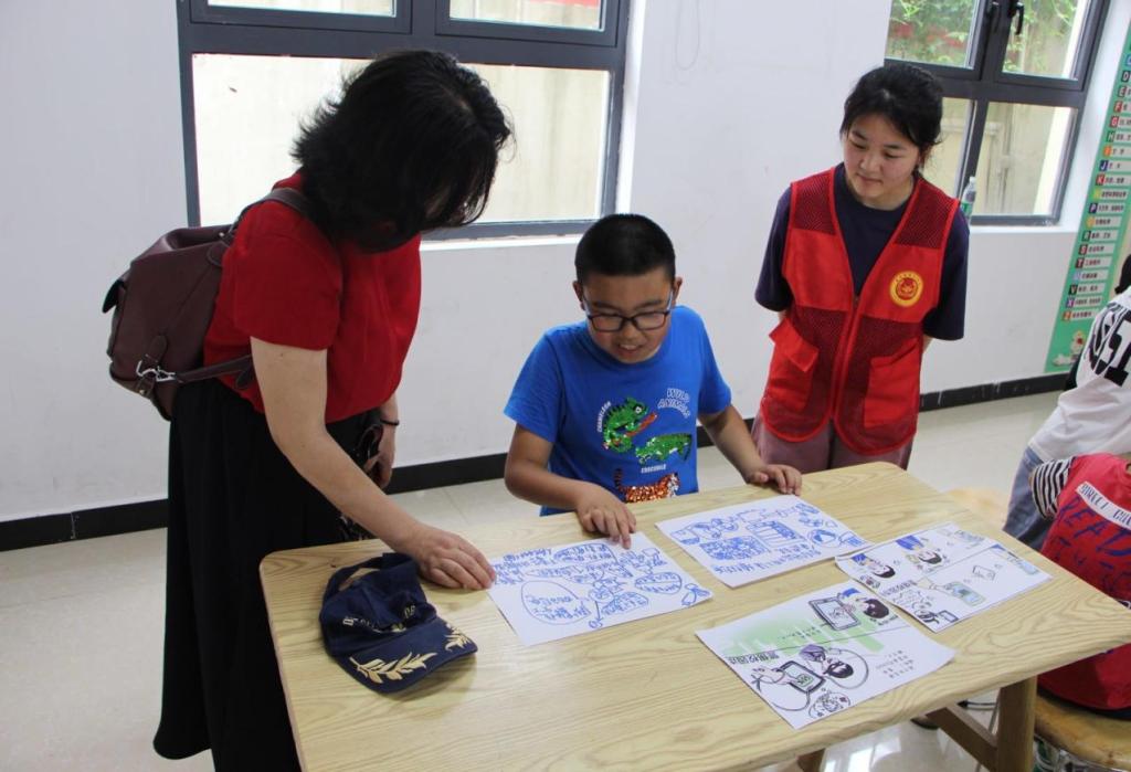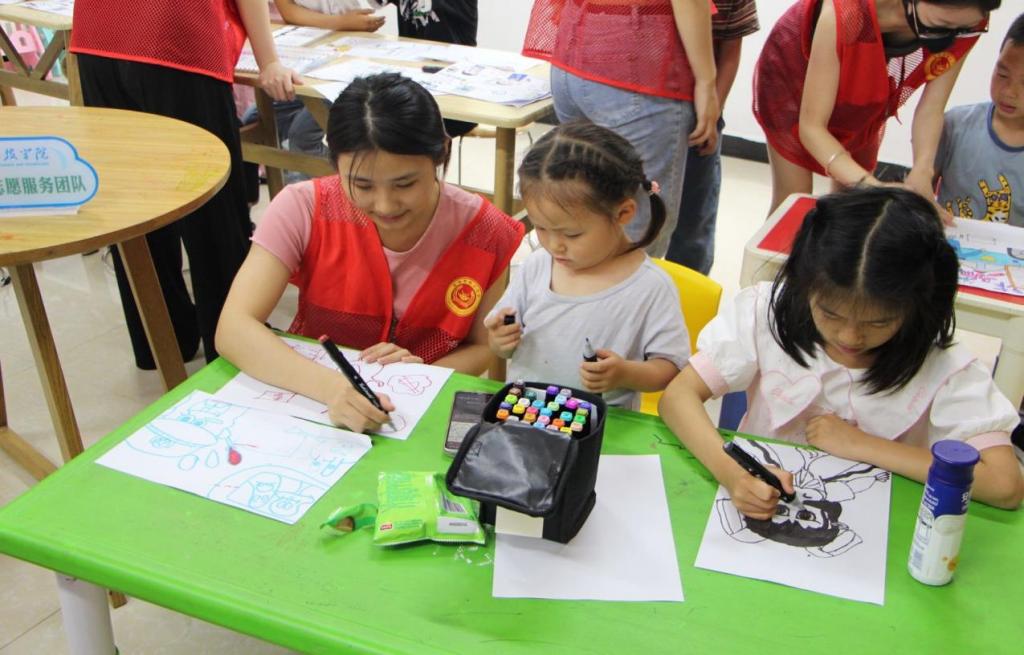 图为绘画组志愿者带领社区孩子绘制“反诈”宣传报
