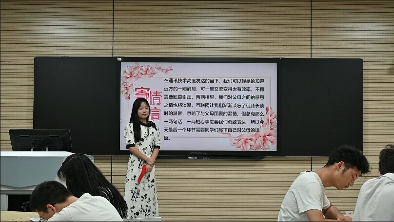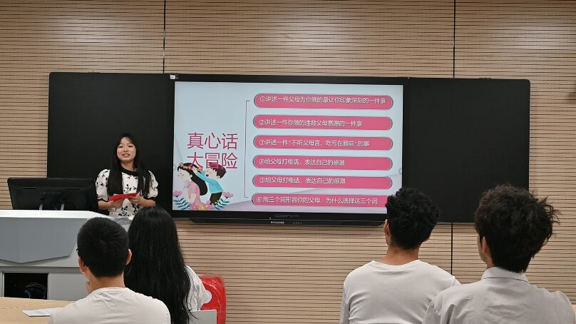 活动伊始,主持人介绍了活动流程,此次活动共设3个项目。在“爱的小测试”环节,同学们通过填写权威的问卷,判断出自己与家庭的亲疏程度和适应程度。第二项活动是“真心话大冒险”,主持人准备了6个与父母有关的真心话或大冒险,抽到真心话的同学与大家分享了自己与父母之间的故事,抽到大冒险的同学则是与父母打电话并说出自己想对父母说的话。在此过程中,同学们都听得专心致志,理解了感恩的内涵,意识到生命的价值来之不易。在“寄情于信”环节中,同学们在信纸上写下想对父母说的话,表达自己的感情。大家在沉思后郑重下笔,认真写下自己心中所想。