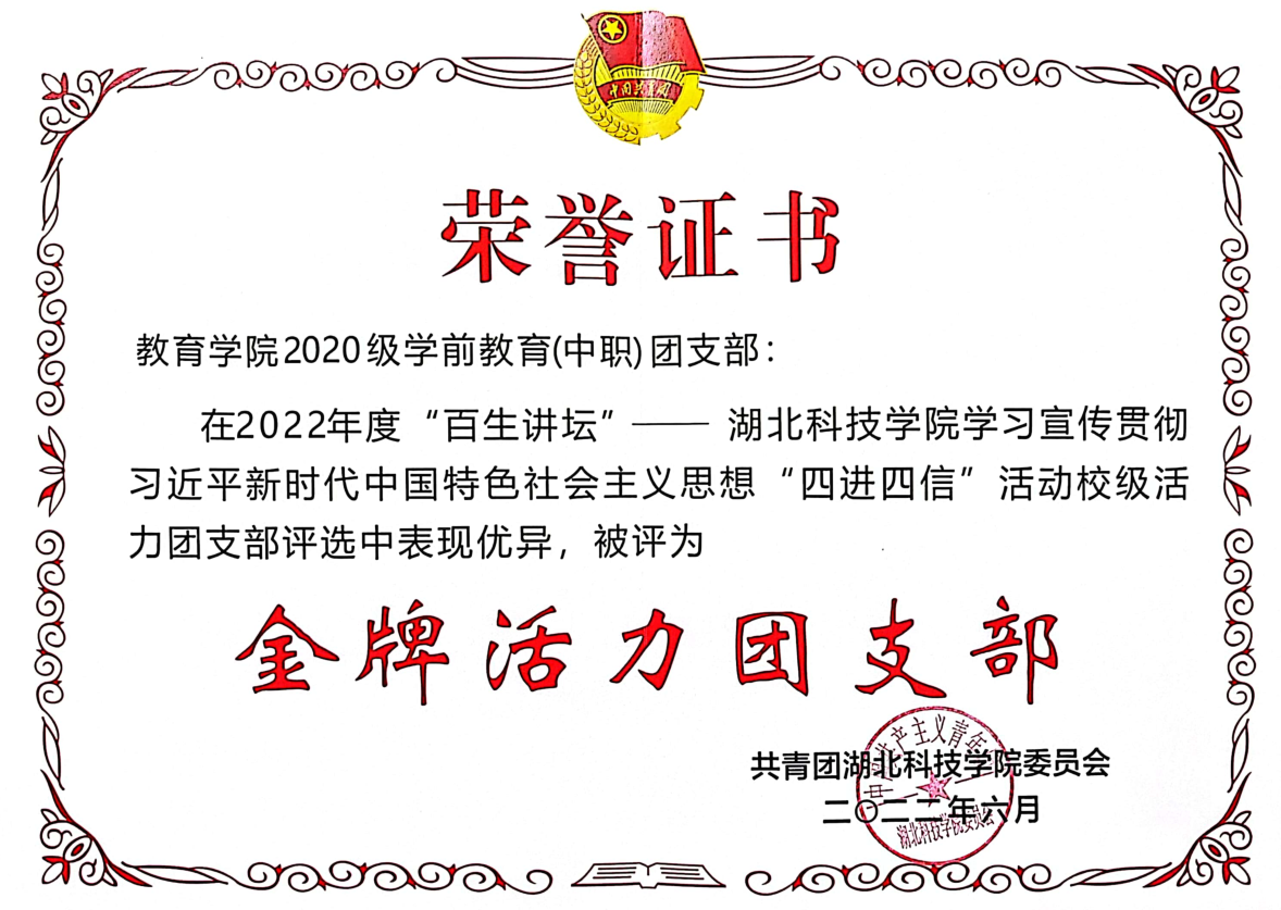 2020级学前教育(中职)团支部积极做好青年思想政治工作,时刻保持本支部团员思想先进性,每周支部成员进行“青年大学习”团课学习,本支部“青年大学习”2022年学习完成率达到100%。7位同学获得咸宁市“青年大学习—学习标兵”,9位同学获得BBIN波音平台百家乐“青年大学习—学习标兵”。同时积极开展主题团日活动、党史专题学习教育活动和团员评议等专题学习。2022年全年开展“党的二十大”等主题团日活动15次,组织 “学党史,强信念,跟党走”学习教育主题团课13次。通过专题学习不断加强对团员的理想信念和国情教育,引领团员青年争做有理想、有本领、有担当的时代新人。此过程中,支部获得“金牌”活力团支部荣誉称号,8人被评为“优秀共青团员”,1人获被评为“优秀共青团干部”。