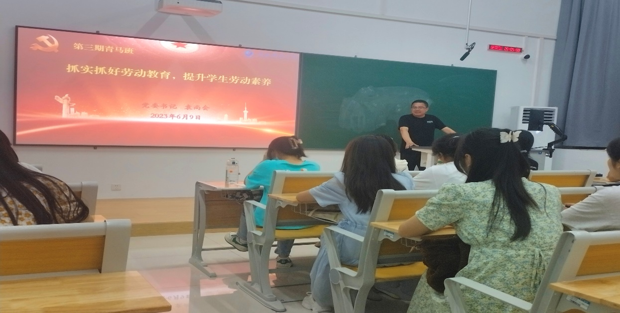 袁书记以《教育抓实抓好劳动教育,提升学生劳动素养》为题,从劳动教育的基本内涵、习近平总书记谈劳动、关于大学生劳动教育的思考三方面展开,为同学们讲解劳动教育是国民体系的重要内容,是学生成长的必要途径,倡导同学们树立劳动最光荣、最崇高、最伟大、最美丽的观念。他引用习近平总书记的话“梦想属于每一个人,广大劳动群众要敢想、敢干、敢于追梦”,叮嘱各位同学明白树立终身学习理念,养成善于学习、勤于思考的重要性。