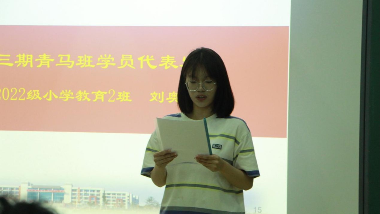 第三期学员代表刘奥凡表示,将坚定共产主义信念,勤奋学习,锐意创新;遵守“青马班”的各项规章及考核制度,树立榜样作用,服务同学、服务学校、服务社会;学以致用,知行合一,深入到农村、社区、企业等基层实践学习等活动,增强自身的时代责任感与使命感。