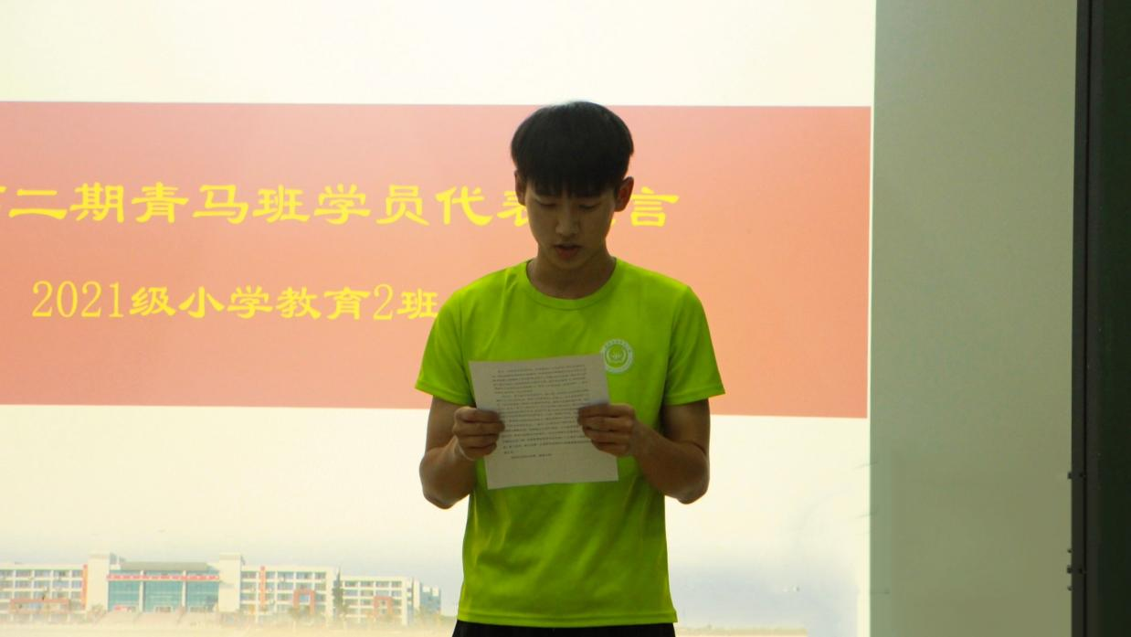 第五项议程,第二期学员代表周霖发言,他表示身为新时代的接班人,我们每一位青年大学生更应该把握住当下学习的机会,提高专业素养和个人能力,为今后的本职工作打下坚实的基础,做青马思想的传承者,做青马思想的践行者。