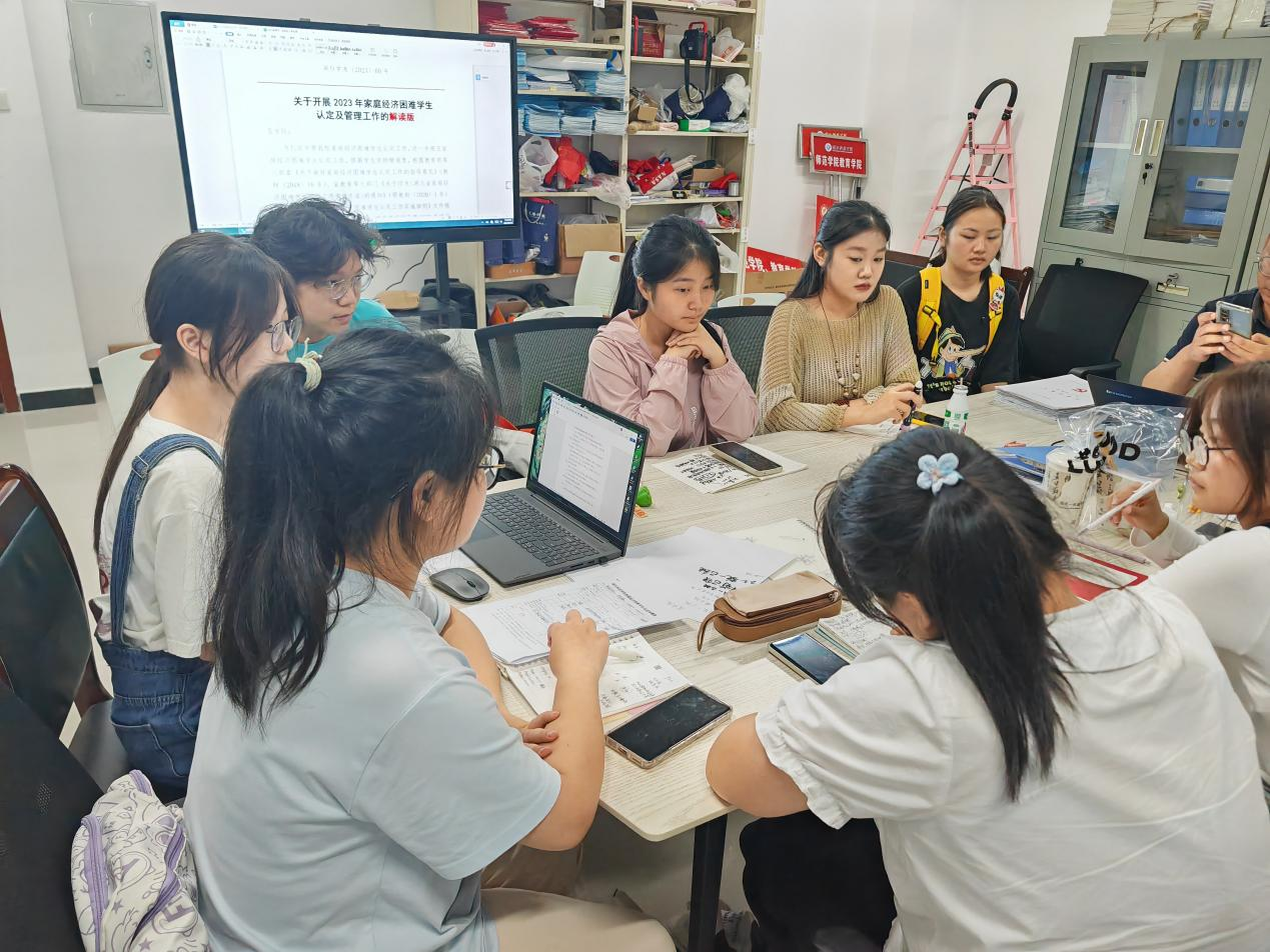 会上,娄强老师带领同学们仔细研读了《关于做好家庭经济困难学生认定工作的指导意见》、《关于印发<湖北省家庭经济困难学生认定工作实施办法>的通知》以及《BBIN波音平台百家乐家庭经济困难学生认定工作实施细则》,并结合我院学生资助工作的具体情况,对《关于开展2023年家庭经济困难学生认定及管理工作的通知》进行了详细解读。