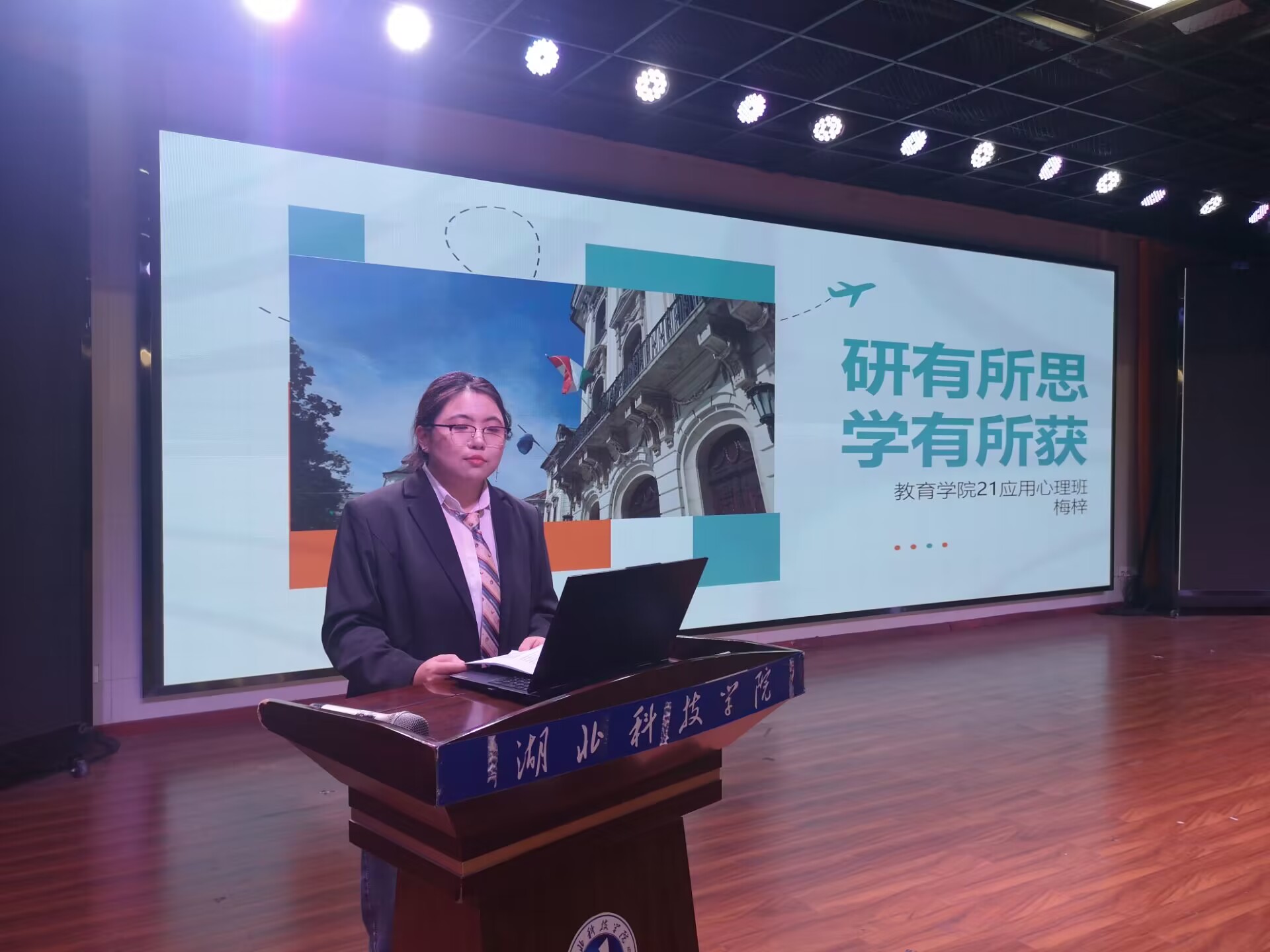 梅梓同学分游之所学、游之所拓、游之所览、游之所识四个板块介绍了游学经历。在游之所学板块,梅梓同学讲述了游学期间学到的知识,介绍了学习英语的经验与方法。为满足同学们的好奇心,她还介绍了所见所闻,一张张匈牙利建筑图片引得同学们惊叹连连。通过梅梓同学的介绍,同学们感受到了异域风情。最后,梅梓同学分享了学习感悟,鼓励大家以立学为基,以读书为本,认真规划大学生活,厚植师德情怀,增强师范技能,为成为“四有”好老师打下坚实基础。