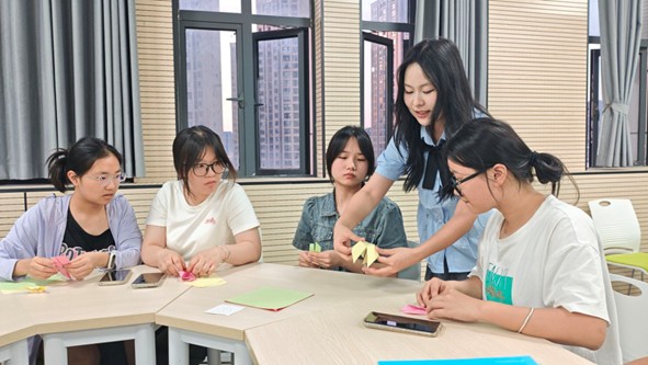 活动分为理论讲解与实践创作两个阶段。娄强老师系统阐释手工创作对情绪调节的积极作用,强调艺术疗愈在心理调适中的科学价值。实践环节中,志愿者现场示范黏土塑形与折纸技法,通过“快乐树”“希望之舟”等范例作品引导创作方向。参与的学生组成12个小组,在90分钟创作中共完成纸艺作品、黏土作品35组,包含承载祈愿的千纸鹤墙、象征成长的破茧蝶等特色作品。