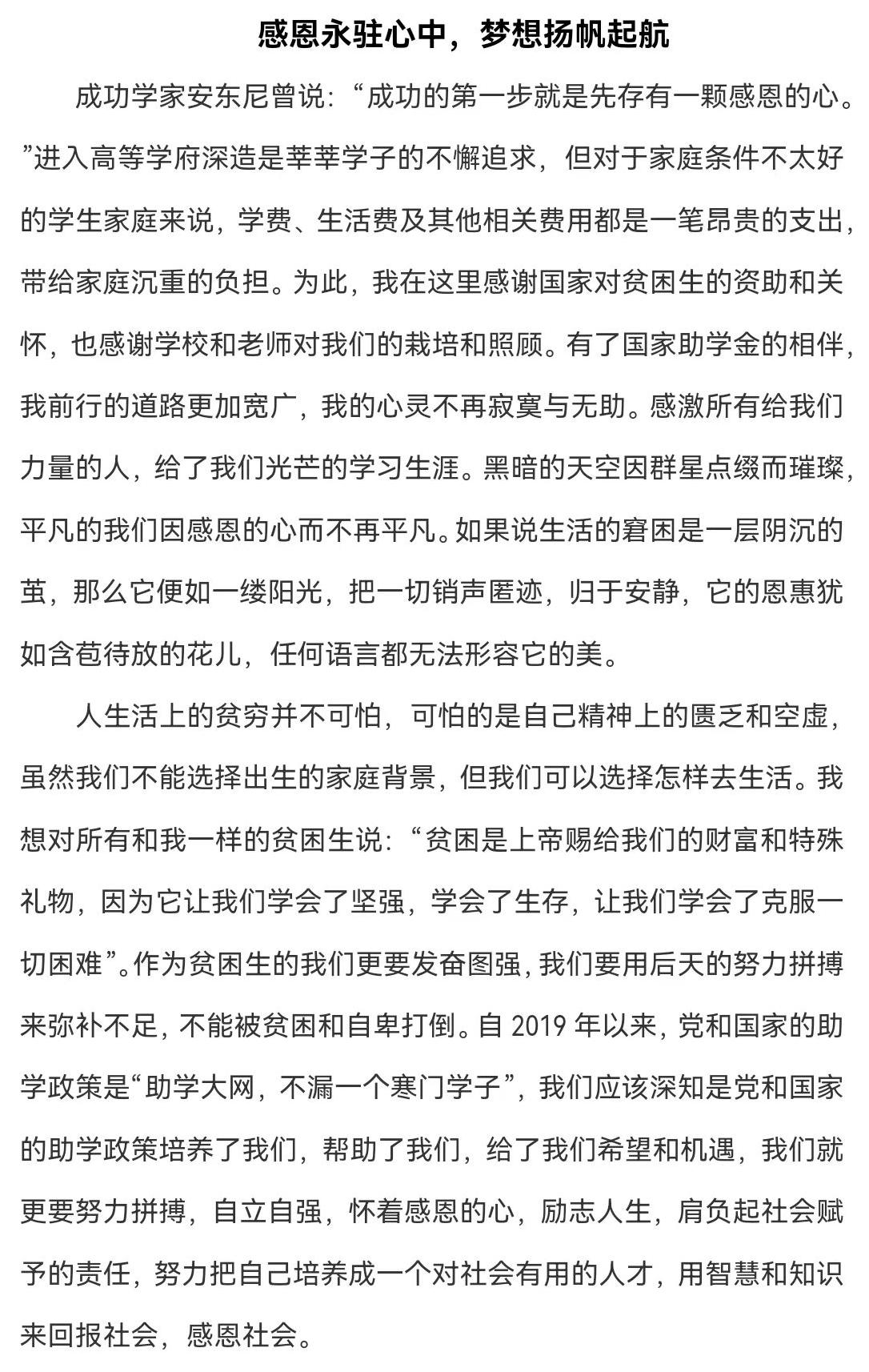 在征文作品中,许多受助学生以第一人称视角,饱含深情地讲述了自己在国家资助政策支持下,克服困难、努力学习、追逐梦想的感人故事;也有教师以第三人称视角,记录了学生在资助关怀下的成长蜕变历程。经专业评审小组严格筛选,最终推选出10篇优秀征文。这些作品情感真挚、内容充实,充分展现了受助学生感恩思源、自强奋斗的精神风貌。