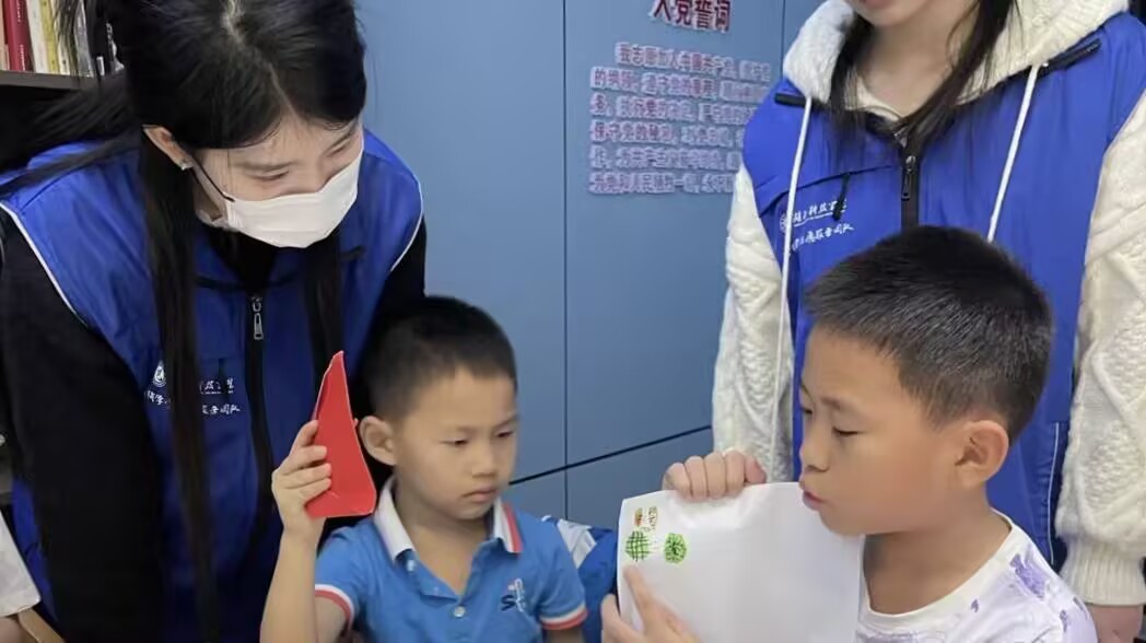 图为志愿者为小朋友们讲解规则