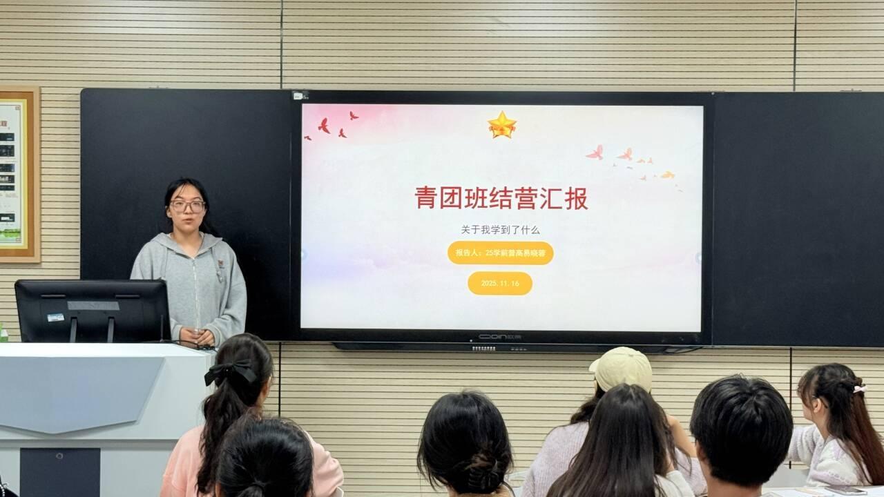 第二组学员的分享聚焦知识吸收与思想淬炼。25级学前教育班易晓蓉同学条理清晰地梳理了“青团班”课程中的核心知识点,从思政理论到学生工作方法,逐一阐述了各类课程对个人能力的提升价值。25级小学教育班许懿同学则围绕思想学习作深度分享,她着重阐述了学习习近平思想的重要意义,认为这为青年学子指明了前进方向,并结合自身经历,讲述了如何通过课程学习明确学生干部的角色定位,掌握高效开展班级工作的实用技巧。