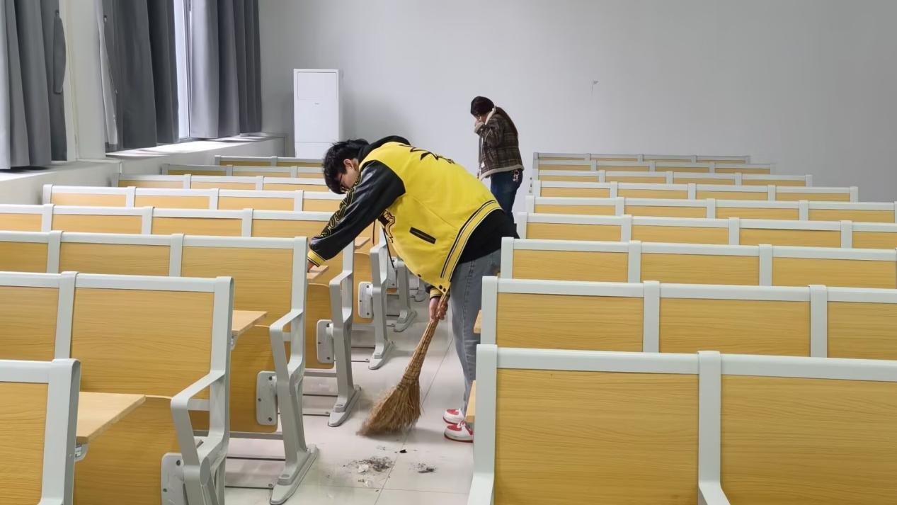 图为志愿者打扫教室
