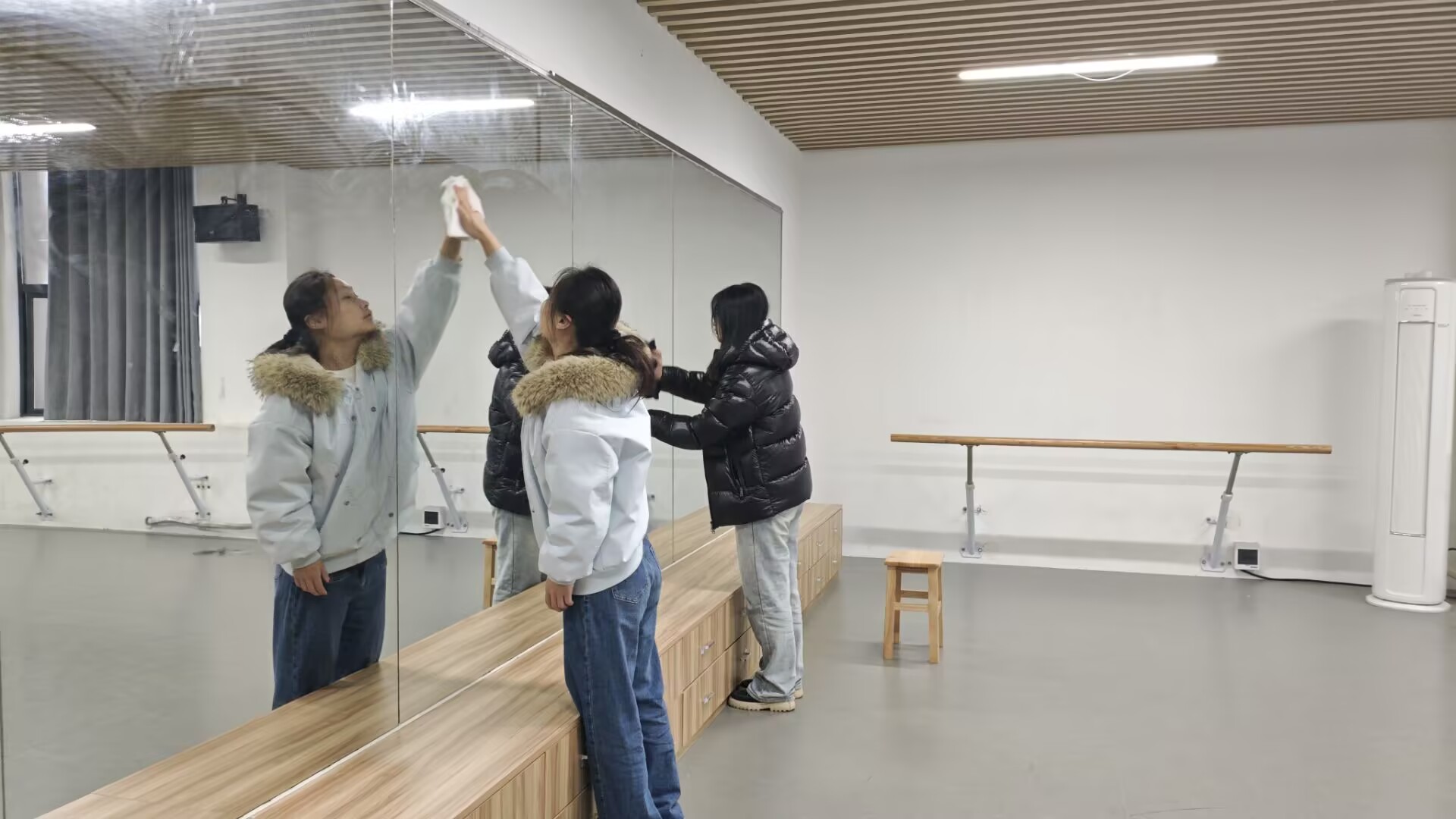 图为志愿者清洁镜面