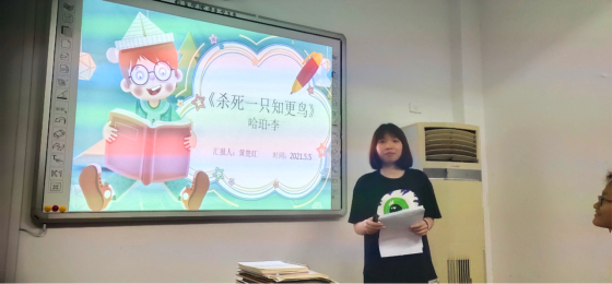 黄楚虹同学分享了《杀死一只知更鸟》。她将全书从作者简介、内容概要、我的感想,三个部分来介绍这本书。书中通过描述主人公的生活与人与人之间的相处的故事来表达出父亲对子女的家庭教育的重要性。面对每一个孩子,我们要以身作则,不管是以后作为父母还是老师,孩子们都是以我们为榜样,先看我们做事,再看别人,所以我们的一言一行一举一动,都要树立一个正确的态度,对待人和事要以公平、善良的原则来处理之间的关系。
