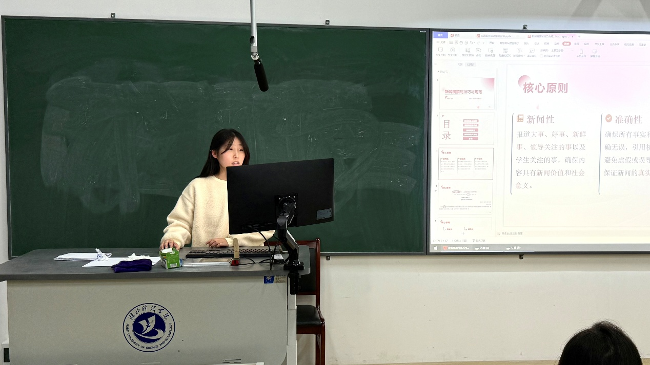 培训伊始,汪卓围绕“新闻稿撰写技巧与规范”展开详细讲解。她结合自身撰写经验,明确新闻稿的三大核心原则——新闻性、准确性和时效性,强调新闻稿需立足事实、突出重点,确保信息传递的及时与精准。随后,汪卓从新闻稿的基本构成入手,拆解标题、导语、主体、结尾等关键模块的撰写要点,针对标题的吸引力、导语的概括性、主体的逻辑性以及结尾的总结性进行逐一分析。同时,她详细解读新闻稿的格式规范,包括字体、行距、落款等细节要求,通过实例对比,让各位同学们直观了解规范撰写与不规范撰写的差异。讲解尾声,汪卓对本次讲解内容进行总结,鼓励学员在实践中灵活运用技巧,提升新闻稿质量。
