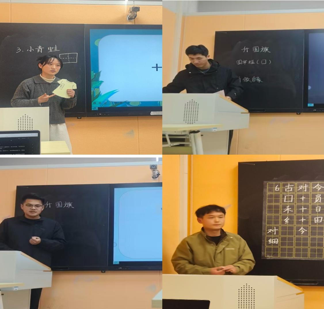 研课磨课,在模拟课堂中锤炼教学功底。活动围绕小学低年段语文教学目标,聚焦《小青蛙》《日月明》《升国旗》《古对今》四个经典篇目,精准对接低年级学生识字写字、朗读表达的核心学习需求。在课程团队的精心安排下,同学们以小组为单位分工协作,依次完成“说课+无生试讲”的教学展示。各小组说课环节中逻辑清晰,能紧扣低段语文教学特点,详细阐述教学思路、学情分析、识字写字重难点及素养落地路径;无生授课环节能充分模拟真实课堂场景,贴合低年级学生认知特点,有效运用趣味课前游戏、多样识字方法、分层朗读训练等策略,巧妙融入爱国主义教育,渗透中华优秀传统文化,尽显对语文课程“工具性与人文性统一”的理解与探索。这场沉浸式的实战演练,全方位检验了同学们的教材解读、教学设计与课堂驾驭能力,展现了同学们扎实的理论功底和教学设计与实施能力。