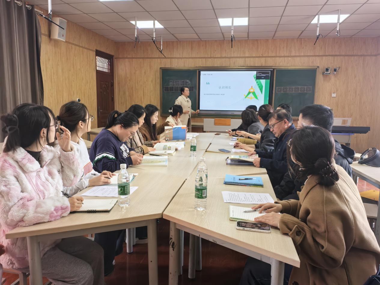 研究生深度赋能,理论实践巧结合。作为此次教研活动的新生力量,我校小数研究生团队充分发挥理论素养优势,深度融入磨课全过程。研讨中,研究生们基于前沿教学理念,围绕教学情境创设、学具优化使用、小组合作组织等关键环节建言献策。针对三年级《周长的认识》一课,建议引入校园花坛、课桌面等生活化素材,通过动手测量与对比辨析,让几何直观与“量感”在体验中自然生长;针对五年级《分数的意义》一课,提出优化实物操作环节,通过“分一分、说一说、比一比”等递进活动,帮助学生从具体情境中抽象出单位“1”的概念,实现思维的有效进阶。这些源于专业视角的建议,既为课堂注入了新鲜活力,也获得了在场名师与教师的一致认可。