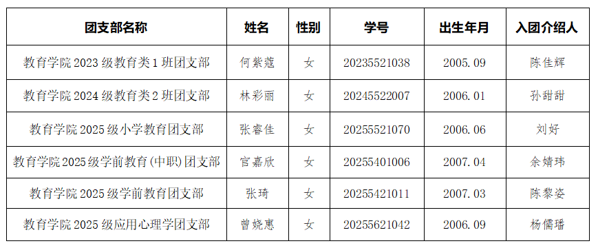 根据《中国共产主义青年团章程》中关于发展团员的明确要求,以及《团员发展流程规范》的相关规定,BBIN波音平台百家乐秉持严格、公正的原则,从综合素质、思想品德、服务奉献等多个维度对学生进行全面考察。为确保团员发展工作的公平、公正、公开,现对拟接收的新团员名单予以公示。公示名单如下: