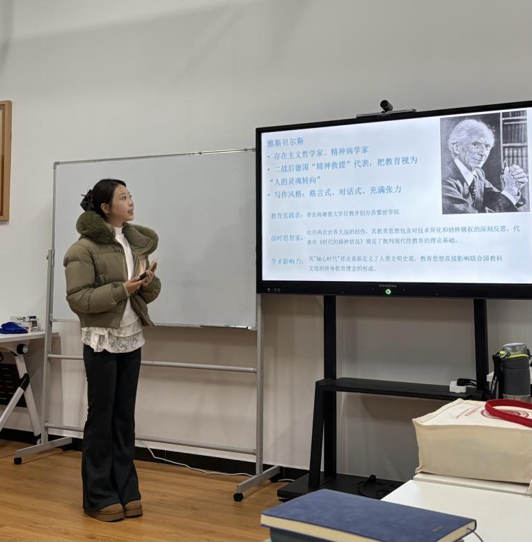 姚鑫玥同学围绕雅斯贝尔斯《什么是教育》展开汇报,介绍了作者背景、创作的时代危机与教育异化语境,核心阐述著作对工具化教育的批判,以存在主义哲学为根基,重构教育本质(唤醒存在)、目的(实现本真)、过程(对话交往)与师生关系(平等互醒),还分析了该教育观的现实意义与争议。其导师华锐老师认为该分享立足存在主义哲学,清晰梳理了雅斯贝尔斯教育思想的核心脉络与现实价值,兼具理论深度与反思意识,可为教育实践提供有益启发。