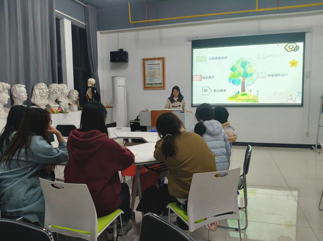 培训会上,活动负责人从心理健康知识、隐私保护、角色与职责、沟通倾听技巧四大核心板块展开系统讲解。在心理健康知识普及环节,负责人结合生动案例,明确了心理健康的连续体属性,详细解读了情绪、认知、躯体、行为四方面的心理问题识别信号,并分享了规律作息、建立支持系统、学习压力管理、培养兴趣爱好等维护心理健康的实用方法,帮助学员们掌握识别学业压力、人际关系困扰等常见问题的基本技巧。在隐私保护模块,负责人强调了保密原则是心理委员工作的核心底线,指出守密不仅能给予同学安全感,更是建立信任、保护同学、明确角色边界的关键。同时,分享了沟通守边界、明确保密例外、日常互动“伪装”等保护隐私的实操技巧,让心理委员在工作中既能倾听陪伴,又能严守法规与校规要求。在角色与职责板块,负责人进一步明确了心理委员作为班级“守门人”“传播者”“倾听者”的多重身份,为后续工作开展划定了清晰定位。在沟通倾听技巧环节,负责人确立了尊重真诚、严格保密、积极关注的沟通核心原则,并提出用“深度尺、回应尺、边界尺”提升倾听质量,同时提醒心理委员要做好自我关怀、及时寻求自身支持,守护好自身心理能量。