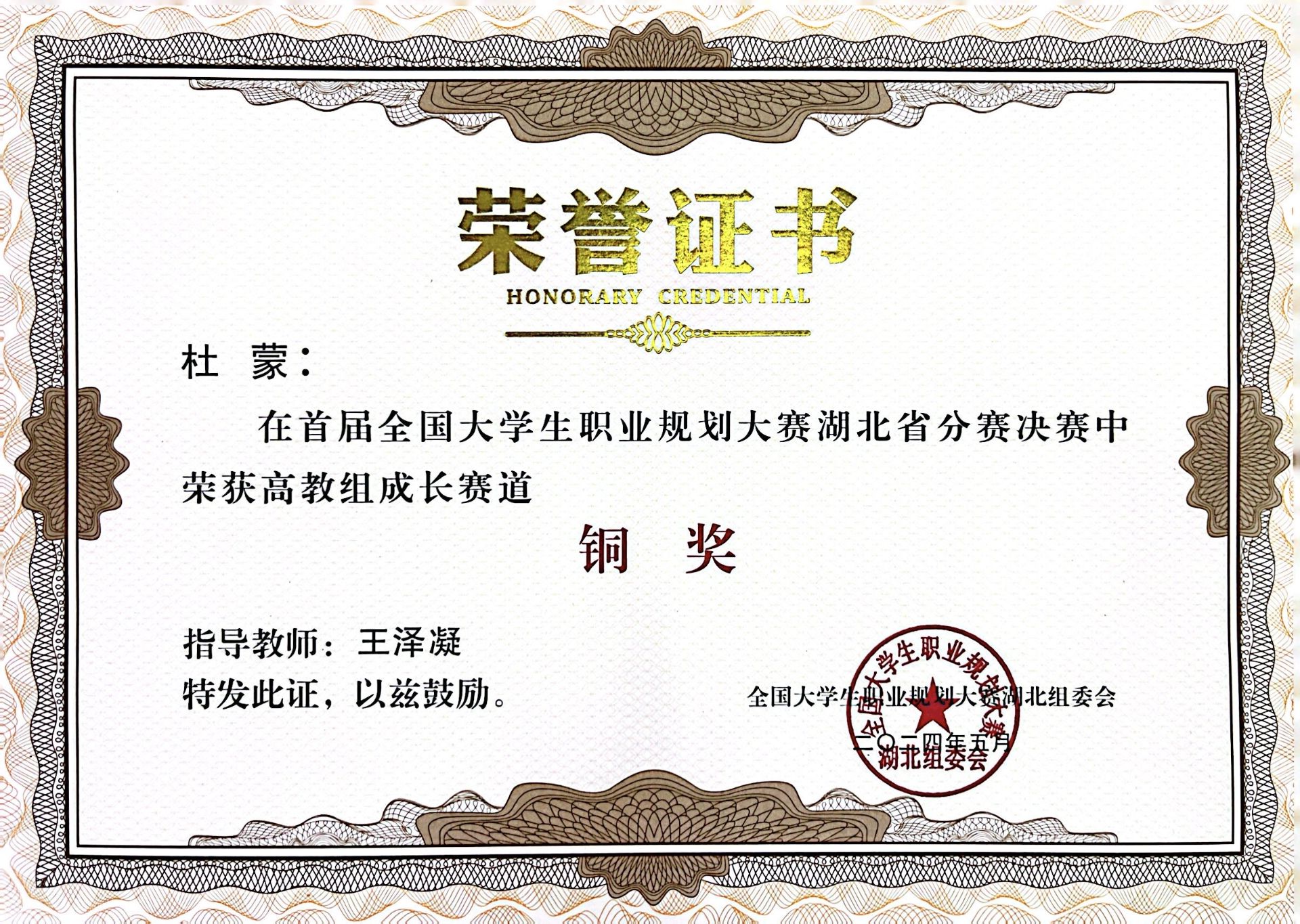 杜蒙:全国首届大学生职业规划大赛湖北省分赛决赛高教组成长赛道铜奖