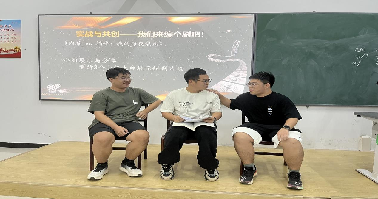 课程最精彩的部分当属“实战与共创”环节,同学们被分成若干小组,围绕《内卷vs躺平:我的深夜焦虑》这一主题,创作并表演一段校园心理剧。各小组纷纷结合自身经历和观察,创作出贴近校园生活的剧本,并在接下来的小组展示环节中进行了表演,生动展现了当代大学生普遍面临的心理冲突。谢艺老师对每个小组的表演都给予了专业点评和技术指导。她指出:“校园心理剧的魅力在于,它不需要华丽的布景和完美的演技,重要的是真实表达和全心参与。”